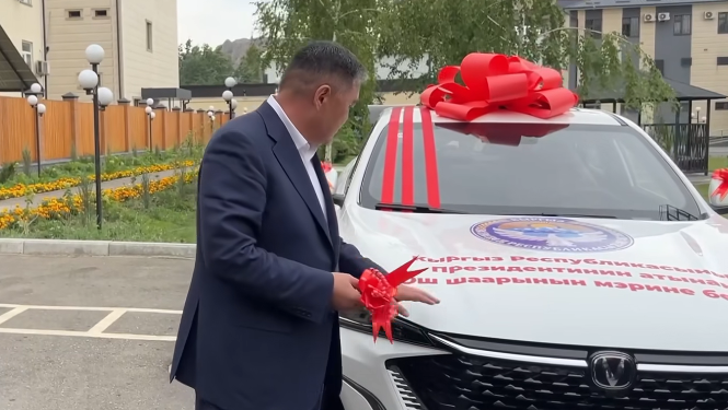 УКМК төрагасы Камчыбек Ташиев бүгүн, 9-июлда Ош шаары жана Ош облусу боюнча жалпы жетекчилер менен болгон жыйындан соң Ош шаарынын мэри Жеңишбек Токторбаевге кечээ күнү убадалаган унааны Садыр Жапаровдун атынан белекке тапшырды.
