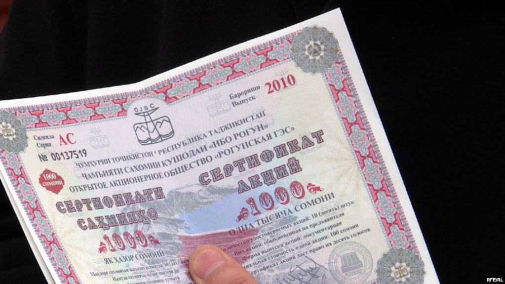 Рогун ГЭСин куруп бүткөрүү үчүн чет өлкөлүк инвестор табуу боюнча бийликтин бир канча жолку ийгиликсиз аракетинен кийин өкмөт 2009-жылы станциянын келечектеги акцияларын сатуу өнөктүгүн баштаган. Анда 900 млн сомони (ошол кездеги курс боюнча 186 миллион доллар) чогултууга мүмкүн болгон, бирок 2012-жылы акцияларды сатуу токтотулган.