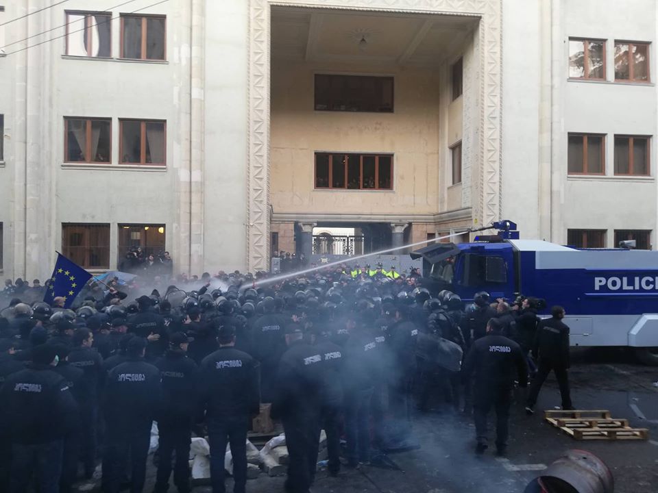 Грузиянын борбору Тблисиде жекешемби күнү кечинде демонстранттар менен полиция кагылышты. Укук коргоо кызматкерлери аларга суу бүркүп, Борбордук шайлоо комиссиясынын алдында чогулгандарга көздөн жаш агызуучу газ колдонду.