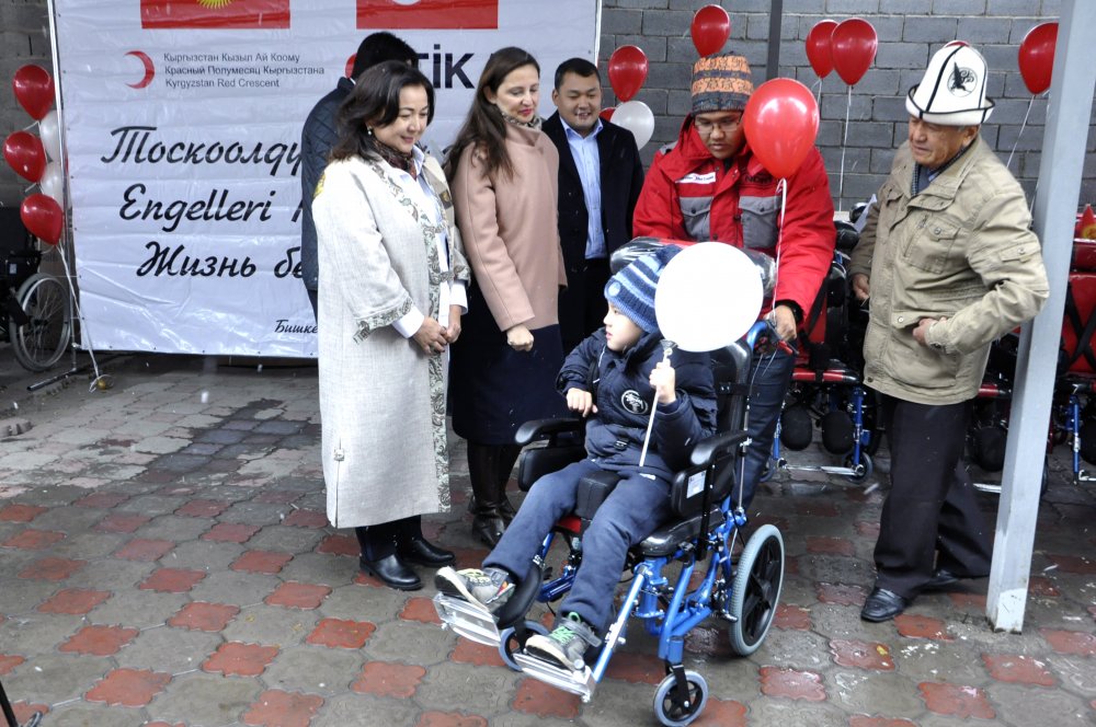 ТИКАнын Бишкек Координаторлугунун “Тоскоолдуксуз жашоо” социалдык компаниясынын негизинде майып коляскаларын тапшыруу үчүн Кыргызстандын Улуттук Кызыл ай коомунда уюштурган аземине Түркиянын Кыргызстандагы атайын жана толук ыйгарым укуктуу элчисинин жубайы Василики Фырат, ТИКАнын Кыргызстандагы Координатору Али Муслу, Кыргыз Кызыл ай коомунун директору Азамат Баялинов, Бишкек шаарынын мэринин орун басары Асель Куламбаева, аталган мекемелердин өкүлдөрү, мүмкүнчүлүгү чектелген жарандар жана жакындары катышышты.