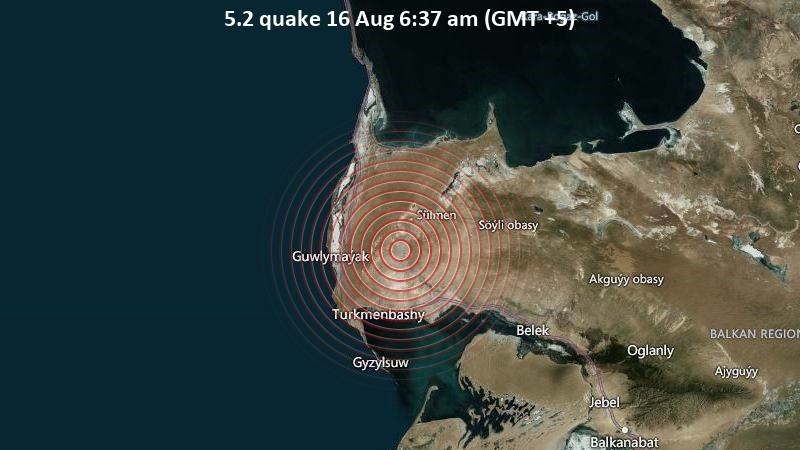 Түркмөнстанда 16-августта саат 06:37де күчү 5,2 баллга жеткен жер титирөө катталды. Жер титирөөнүн очогу Түркмөнбашы шаарынан 31 чакырым алыстыкта, 44,8 чакырым тереңдикте жайгашкан, деп жазат Turkmen News.