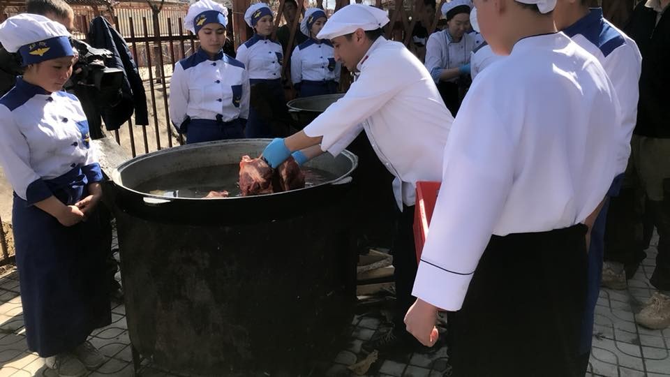 Бишкек шаарынын Горький Чолпон-Ата көчөлөрүнүн кесилишинде эртеңки чоң маарекеге карата бир тонна "Бешбармактын" этин бышырып жатышат. Мындан сырткары бүгүн эт тууроо боюнча мелдеш өтмөкчү.