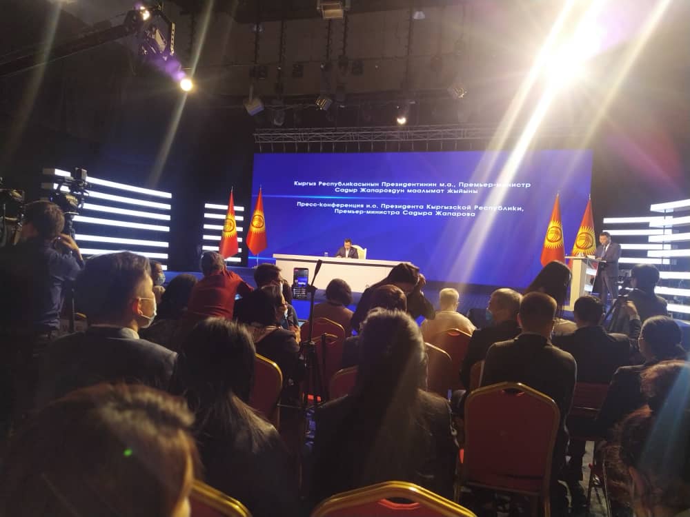 Президенттин милдетин аткаруучу жана премьер-министр Садыр Жапаров ЖМК өкүлдөрүнө маалымат жыйын өткөрүүдө.