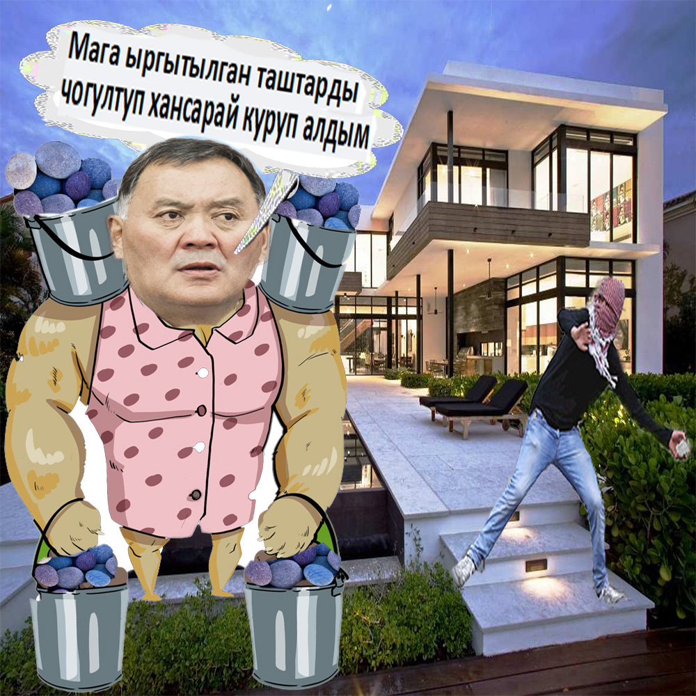 Мүлкүн бүт конфискация кылыш керек. Хан сарайын 2 га жердеги салынган квартирада жүргөн кедейлерге алып бериш керек. Бул Шрек бир апаны өлтүрдү контейнерге кыпчып. Аны ошол контейнерине камаш керек, укук коргочуга кошуналары арыз жазышсын, мейли алар кылмыш иштерин козгошсун. Байлыктарын мамлекетке же кедей жесир кембагалдарга таратып бериш керек. Бул депутатты таш бараңга алган да аздык кылат! Ташбараңга алуу бул элдин чечими менен болот. Илгери зөөкүр адам чыкса эл ташбараңга алып коюшчу экен.