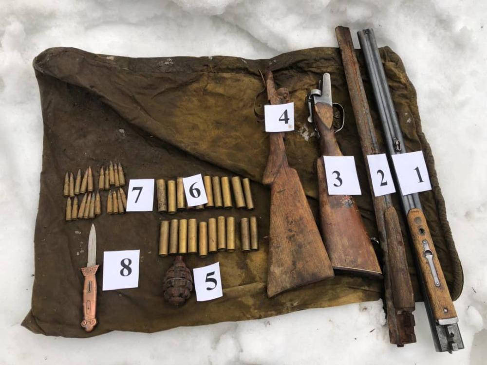 Билдирүүгө ылайык, кампадан "Ф-1" кол гранатасы, 2 жылмакай көзөнөктүү мылтык, ар кандай калибрдеги 40 ок жана бычак табылган.