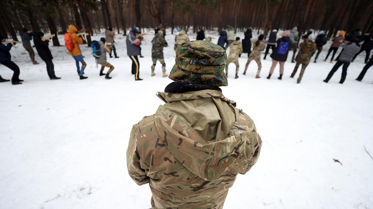 Украинанын борбору Киевде согуш ыктымалдыгына каршы армиянын резервдеги бөлүктөрүндө карапайым калкка алгачкы аскердик даярдыктар өтүүдө.