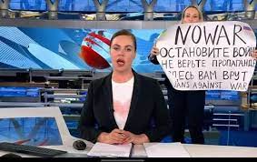 Марина Овсянникова 14-мартта “Время" программасынын кечки чыгарылышындагы түз эфирде студияга кирип барып, алып баруучу Екатерина Андрееванын артына туруп: "Согушту токтоткула! Пропагандага ишенбегиле. Бул жерде силерге калп айтып жатышат" деген плакатты көтөрүп чыккан. Ал "Согушту токтоткула!" жана "Согушка жол жок!" деп кыйкыра баштаганда режиссёрлор эфирди башка сюжеттин кадрлары менен жабууга аргасыз болушкан.