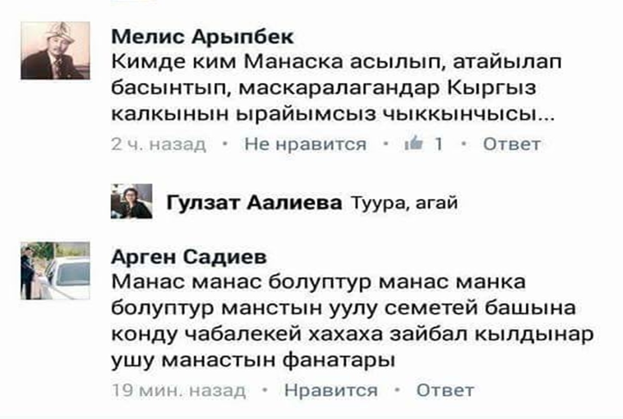 Ал тургай, динди бетине кармап алышып, кыргыздын руханий маданиятынын туу чокусу болгон «Манас» эпосуна чейин асылып, Сиз министр болуп иштеп жаткан мамлекетти түптөгөн Манас баатырды порнографиялык мазмунда ашата сөккөнү тууралуу маалыматты бул шилтемеден көрүп коюңуз: