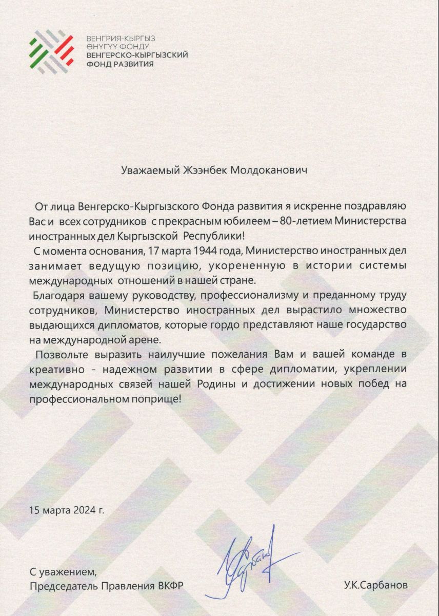 Венгер-Кыргыз өнүктүрүү фондунунун башкармалыгынын Төрагасы Улан Сарбанов Кыргыз Республикасынын Тышкы иштер министри Жээнбек Кулубаевге өлкөнүн тышкы саясат ведомствосунун түзүлгөндүгүнүн 80 жылдыгына карата куттуктоо катын жолдоду.