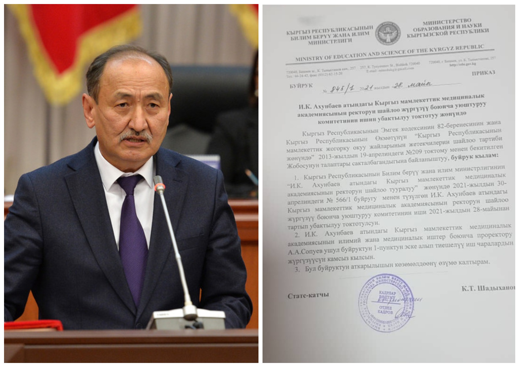 Кызыгы бул документ, эртеңки 28-май күнү менен катталганы кызык болду. Бизге жеткен маалымат боюнча медакадемиянын ректорлугуна А.Бейшеналиевди коюу максатында К.Шадыхановду атайын Билим министрлигине алып келишкен.
