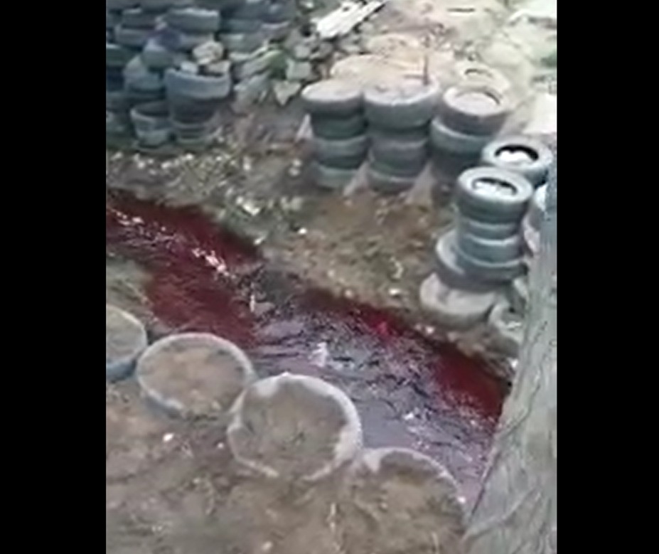 Видеотасмадагы маалыматка таянсак, аталган аймактын жогору жагында мал союлуп, андан чыккан кан сууга куюлат. Ошондон улам суу канга боёлуп, күнүнө бир маал кандуу суу агып турат.