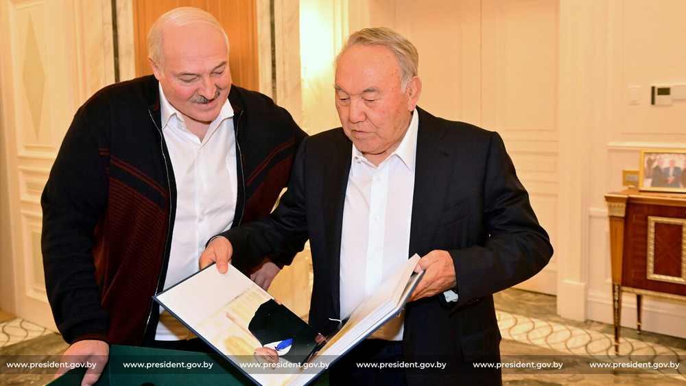 "Лукашенко менен Назарбаевдин жолугушуусу жылуу маанайда өттү. Алар турмуштук маселелерди талкууладык, өткөн жылдарда чогуу катышкан маанилүү окуяларга токтолду. Нурсултан Назарбаев Александр Лукашенкого биргелешкен сүрөттөрү камтылган альбом белек кылды", - деп айтылат маалыматта.