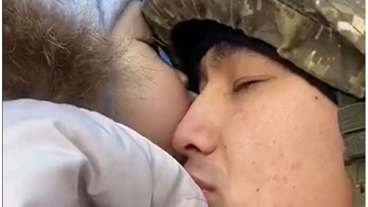 Андан кичинекей бөбөк камфуляжчан жана каска кийип турган жоокерди кучактап, аскердик оор кийим жолтоо кылганына карабай быйтыйган колдору менен кучактап, атасынын көздөрүнөн, бетинен өөп жатканын көрүүгө болот.