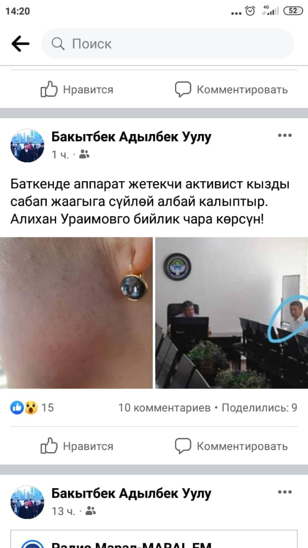 Маалым болгондой, бүгүн депутаттардын көчмө жыйынына барган активист Батмакан Жолболдуеваны Баткен облусунун аппарат жетекчиси сабап, чачынан сүйрөп, колдорун кызарткан.