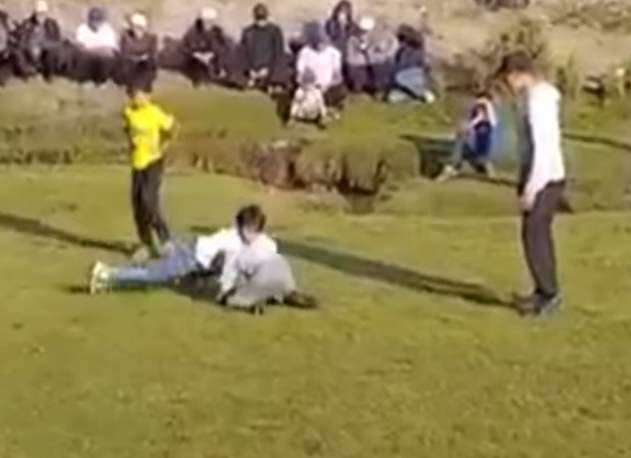 Видеодон чогулган элди көрүүгө болот. Ошондой эле, анда мелдеш өтүп жатканы байкалат.