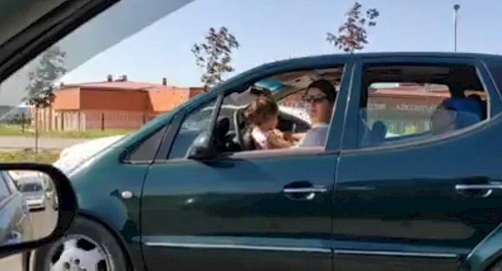 Белгилей кетсек, Бишкек шаарынын Түштүк магистраль көчөсүндө баласын алдына отургузуп, унаа башкарып бара жаткан аялды окуяны күбөлөр видеого тартып алган.