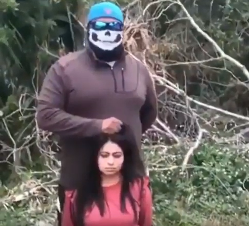Бет кап кийген адам алдында тизелеп олтурган аялды чачынан тартып кекиртекке тартканы турат.
