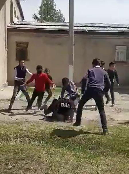 Кадрдан мектептин короосунда бир топ окуучу балдар бири-бири менен мушташып жатканын көрүүгө болот.