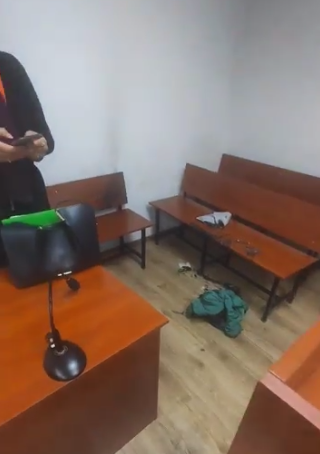 Ал эми күбөлөрдүн айтымында, сот залдарынын биринде алдамчылардан жабыркаган делген белгисиз аял шектүүгө бензин чачып, аны же балким өзүн өрттөөгө аракет кылган.