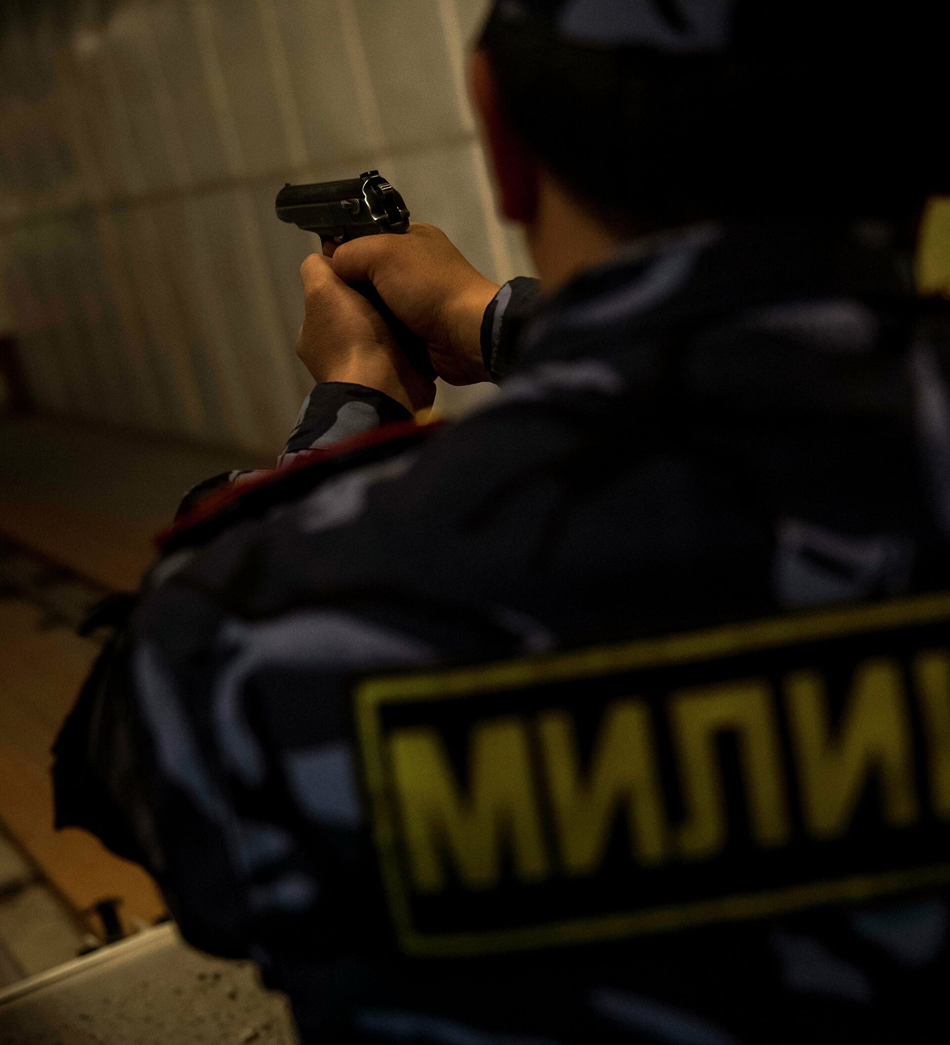 Кадрларда көрүнүп тургандай, милиционер айдоочуга курал кезеп, жанында турган кесиптеши ага тапанчаны түшүр дегендей жаңсап жатат. Көп кабаттуу үйдөгү батирдин терезесинен тартып жаткан киши атпа деп суранат.