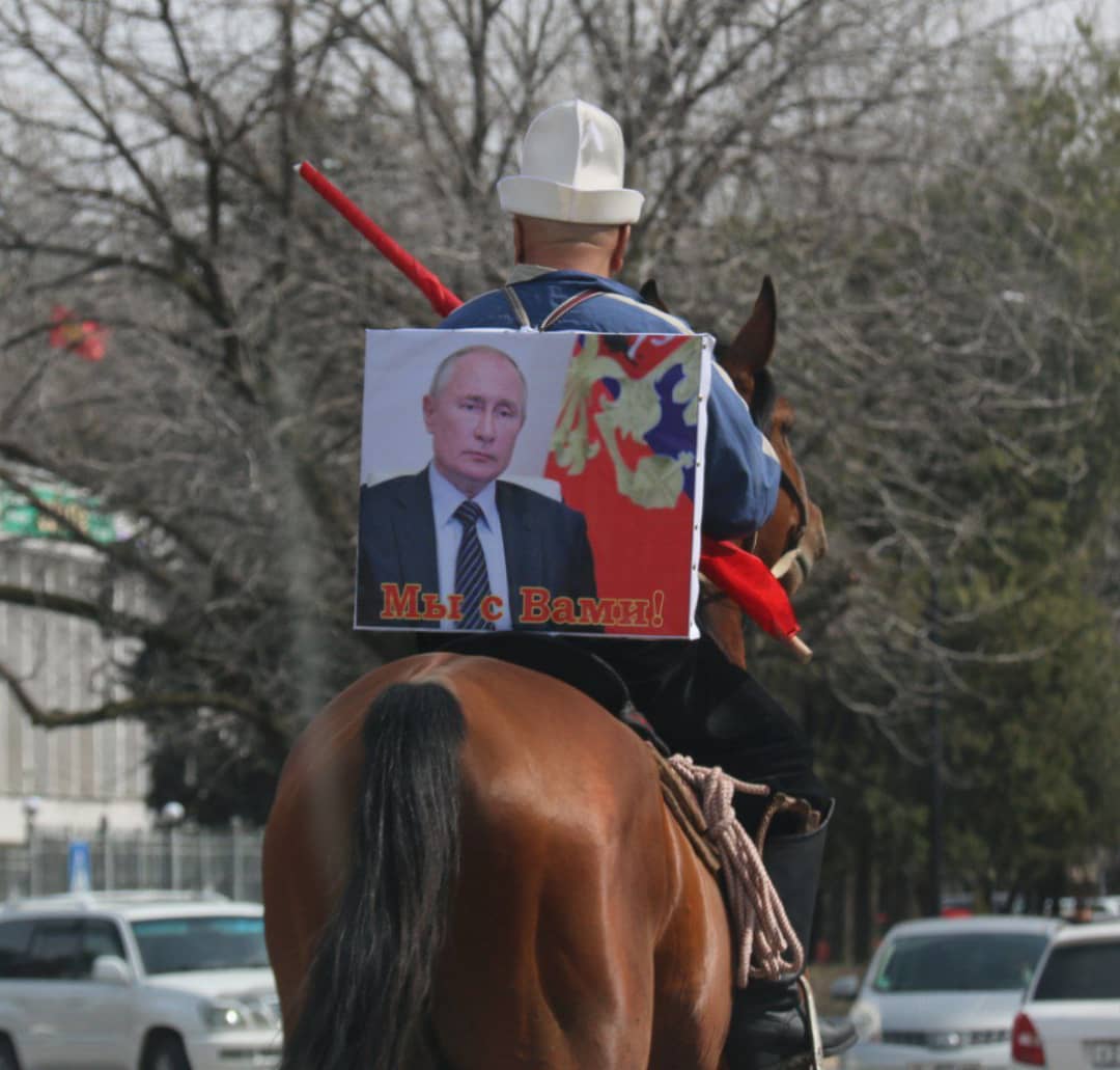 «Мы с Путиным!» («Биз Путин мененбиз!») деп жазып, Путиндин сүрөтү тартылган плакатты артына илип алган атчан киши Ак үйдүн жанында жүрөт.
