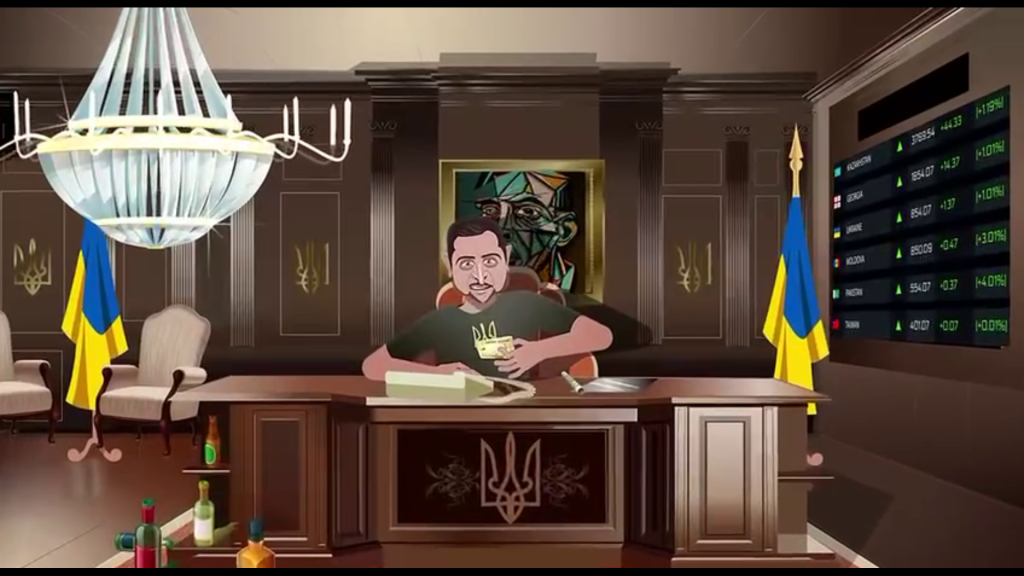 Ошол эле маалда батыштык өнөктөштөр ыраазы болуп, президенттин чемоданына акча түшүп, мамлекет башчы өзү эч нерседен баш тартпай, өз жыргалчылыгы үчүн жашап жатканы көрсөтүлөт.