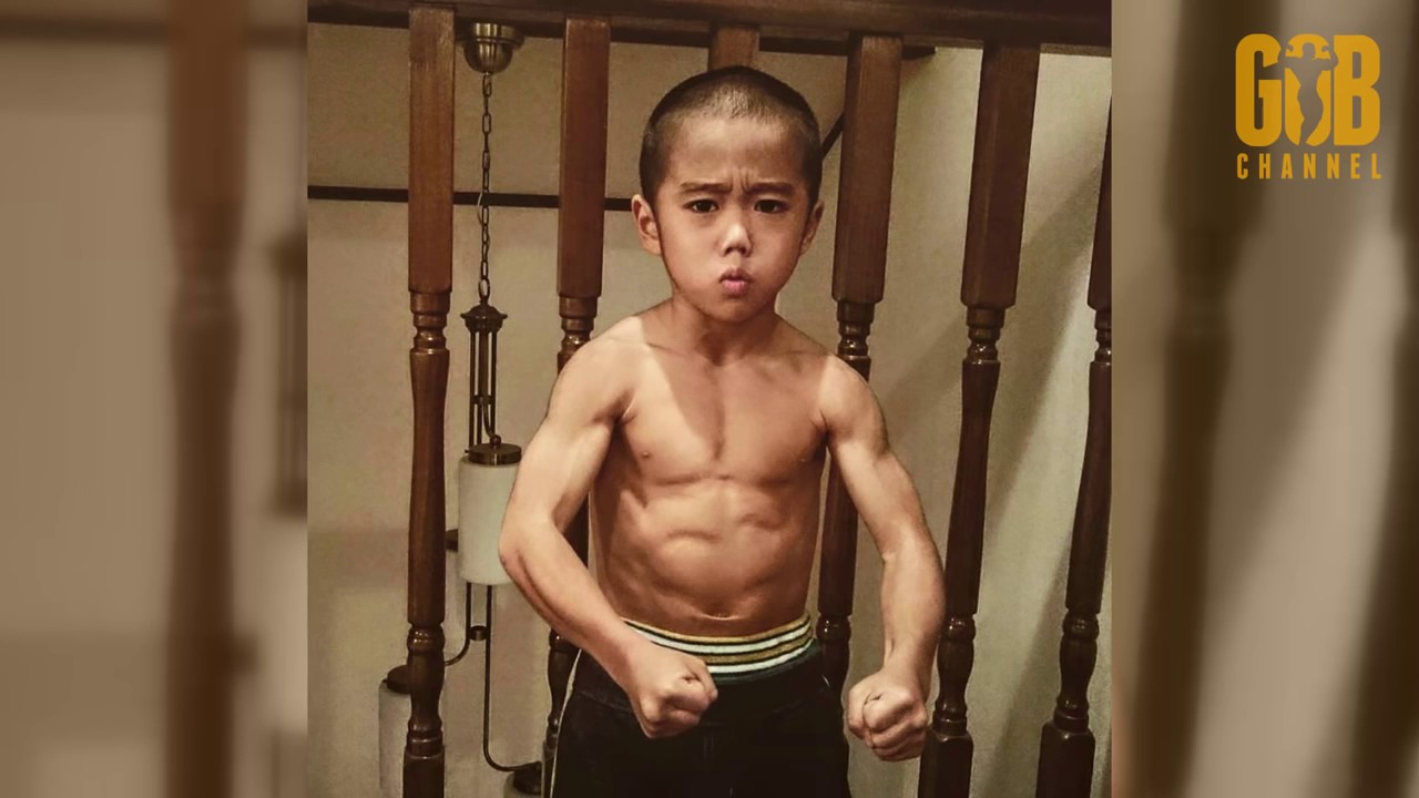 "Кичинекей Брюс Ли" аттыкан жети жашар Рюдзи Имаи машыгып жатып, денесин атлеттердикиндей кылып чыңалткан.
