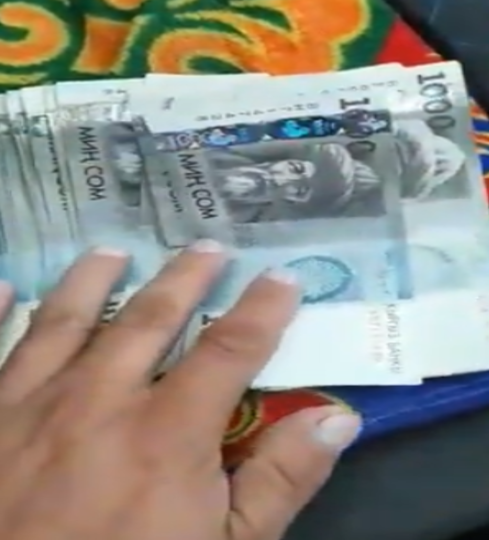 Унаанын ичинде миң сомдуктар жайылып жатат. Кадр артында комментарий кылып жаткан автордун айтымында, болжолу мында 100 миң сом бар.