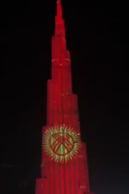 1-ноябрь кечинде Президент Жапаровдун сапарынын урматына Дубай шаарындагы эң бийик Бурж-Халифа имараты Кыргыз Республикасынын туусунун түсүнө боелду. Бул тууралуу президенттин маалымат катчысы Эрбол Султанбаев Фейсбуктагы баракчасына жазып, видео жүктөдү.