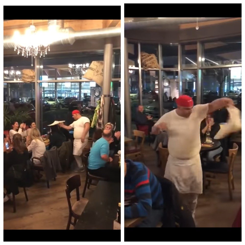 Интернет баракчаларында ашпозчунун пицца камырын колуна алып, залдагы меймандардын алдында бийлеген видеосу тараган. Бул тууралуу NUR.KZ жазып чыккан.