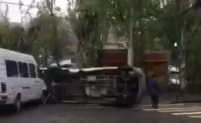 Видеодо көрүнгөндөй, 2 кичи автобус сүзүшүп, бири оодарылып калган.