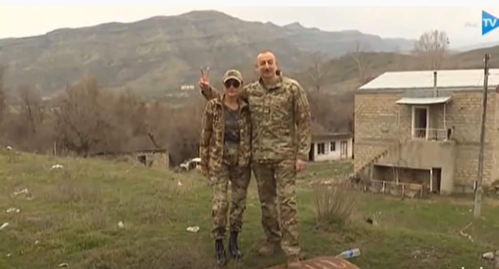 Маалыматтарга караганда, Алиев жана анын жубайы, биринчи вице-президент Мехрибан Алиева Губадли жана Зангилан аймактарында болушкан. Мамлекет башчынун бул сапары туулган күнүнүн алдында болгон. Алиев жоокерлерден армян тилинде жазылган жазууну бузуп салууну өтүндү. Аскер кызматкерлери анын тилегин орундатышты. Андан кийин Алиев белгини жерде тебелеп, аялы менен сүрөткө түшкөн. Ал ошондой эле армяндар азербайжандарды көздөй ок чыгарса, алар кыйроого учурай тургандыгын билдирди.