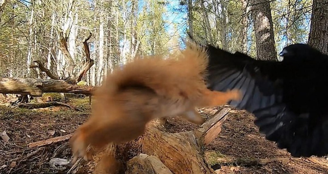 Тыйын чычкан анын жаңгактарын уурдап жаткан канаттууну көрүп калып, аны кууп жибергенге аракет кылган. Бирок карга бир нече жаңгакты алып кеткенге жетишкен.