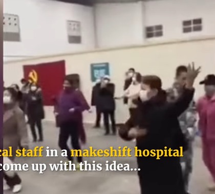 Кадрлардан улуттук музыканын коштоосунда бейтап менен бийлеп жаткан эки медикти көрүүгө болот. Алар коргоочу костюмдарды кийип алышкан. Оорулуулар бири-биринен бир жарым метрдей алыс туруп бийлешкен.