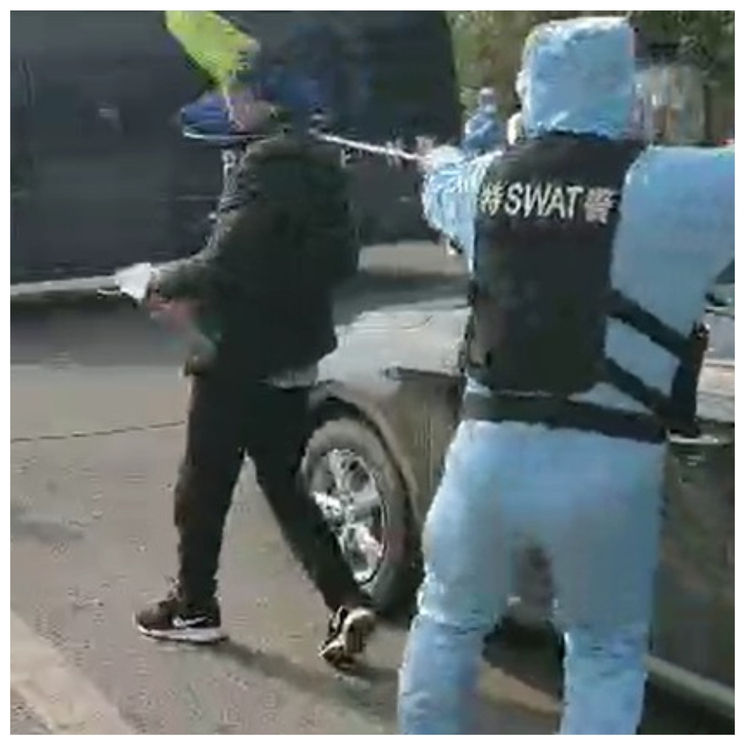 Ал адам унаанын ичинен чыкпастан качып кетүүгө аракет кылат. Бирок, анын ою ишке ашпай, алдынан чоң полициянын унаасы тосуп калып, кайырмакка илип алышты.
