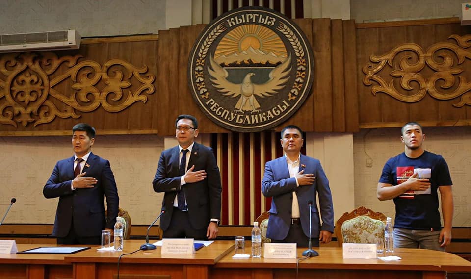 Исмаил Матраимовго тиешелүү кайрымдуулук фонду Токиодо күмүш медаль уткан Акжол Махмудовго батир белек кылды.