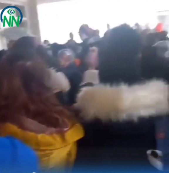 Кадрдан көрүнүп тургандай, окуучулар эшикке батпай бири-бирин тебелеп жатышат.