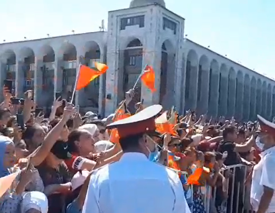 Токио-2020 Олимпиадасына катышып келген кыргызстандык спортчуларды "Ала-Тоо" аянтында жык-жыйма топтолгон эл чоң сүрөөн менен тосуп алды. Жеринен кабарчыбыз билдиргендей, аянтка келген эл менен кошо президент Садыр Жапаров өзү да чыкты.