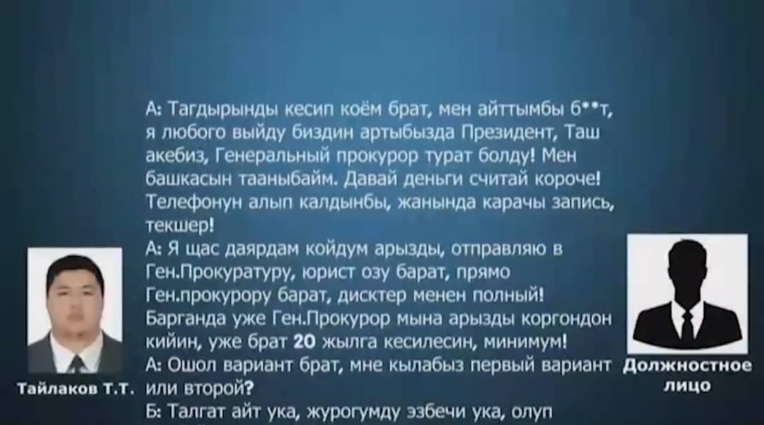 Кармалган жаран мурдагы кызмат ордунда иштеген фактысына таянып жана ошондой эле кара өзгөй максатты коздоп өлкө башчысы, УКМКнын төрагасы жана Башкы прокурор менен байланышы бар деген жалган маалыматты жамынып алып, мыйзамсыз текшеруу иштерин жүргүзгөн. Майда мыйзам бузууларды таап, коркутуу жолу менен мамлекеттик кызматкерлерден акчалай пара алып келген.