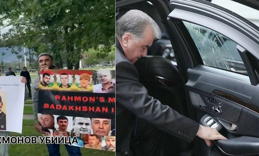 Берлинде “Группа 24” кыймылынын тажик оппозициясынын тарапкерлери Тажикстандын президентинин кортежине жумуртка ыргытып, сүрөткө караганда, Эмомали Рахмон отурган арткы терезесине тийген.