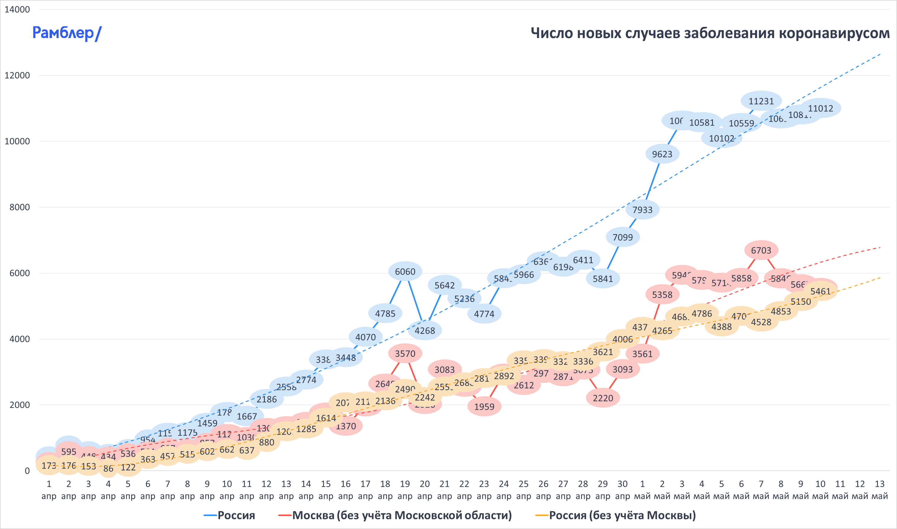 Акыркы 24 саат ичинде Россияда 11 012 коронавирустун жаңы учурлары аныкталды. Бейтаптардын дээрлик жарымы (42.4%) оорунун клиникалык көрүнүштөрүнө ээ эмес. Мындай сандарды 10-майда COVID-19 менен күрөшүү боюнча оперативдүү штаб бергенин орусиялык басылмалар жазып чыкты.