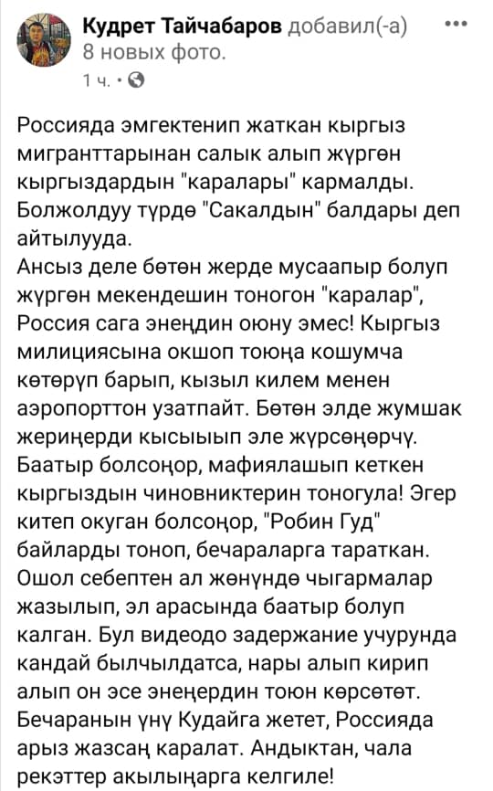 Фейсбук социалдык тармагынын колдонуучусу Кудрет Тачабаров өздүк баракчасына “Россияда эмгектенип жаткан кыргыз мигранттарынан салык алып жүргөн кыргыздардын "каралары" кармалды” деп билдирүү жазып чыкты.