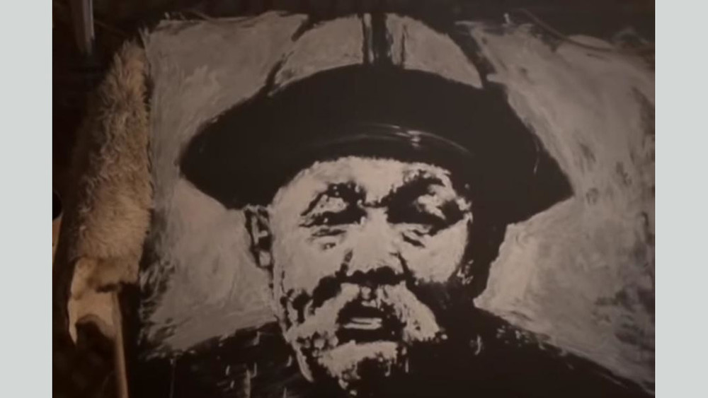 Сүрөтчү Төлгөбек Койчуманов манасчы Саякбай Каралаевдин портретин айран менен тартты.