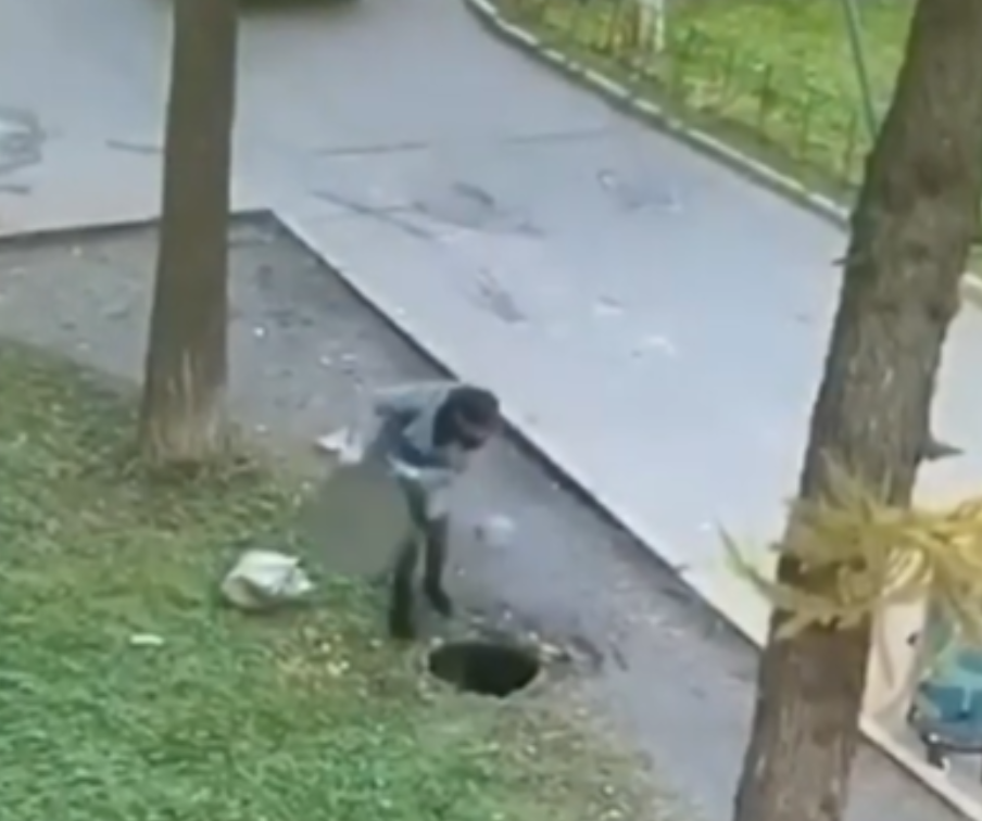 Адамдар басчу жалгыз аяк жол. Колунда түрткөн коляска, жанында 2 жашка чыга элек баласын ээрчиткен эне жай баракат сейилдеп келе жатышат. Ал аңгыча чала жабылган канализациялык люктун үстүн баскан баласы, жылмышып ичине түшүп кетти.