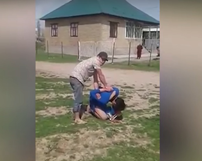 Төмөндөгү видео-тасмага көз чаптырсак, көк түстөгү, узун көйнөк кийген баланы айыл тургундарынын бири кармап алып, “эмне үчүн мындай кийинип алдың, заказнойсуң” деп колун кайрып жатканын көрүүгө болот. Аңгыча айыл тургундары да окуяга кызыгуу менен тегеректеп чогулуп калышты.