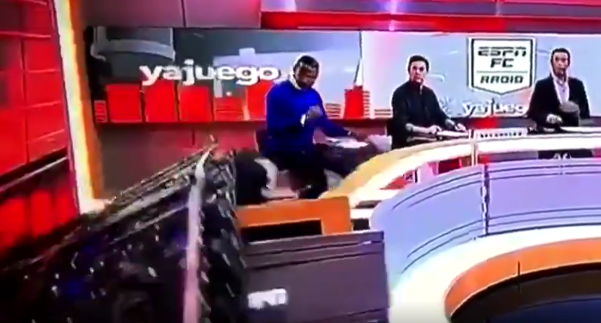 Shocking video. ESPN anchor crushed live on the air by falling set piece. Thankfully he was uninjured. pic.twitter.com/CeFxy8AksY