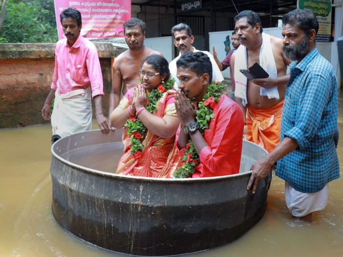 So this couple from Alappuzha district in Kerala used a large cooking vessel to wade through the flood water to get to their wedding venue. Even the wedding venue was flooded, but fortunately they managed to get married without missing the muhurtham time :) pic.twitter.com/mqldzgKIkd