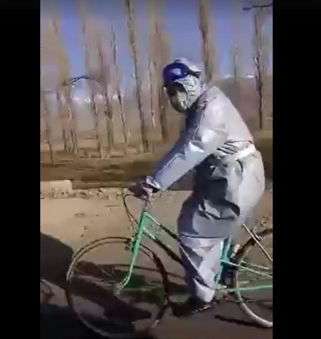 Видео-тасмага көз чаптырсак, медайым атайын коргонуучу кийим кийип алып, велосипед менен жумушка бара жатканын көрүүгө болот.
