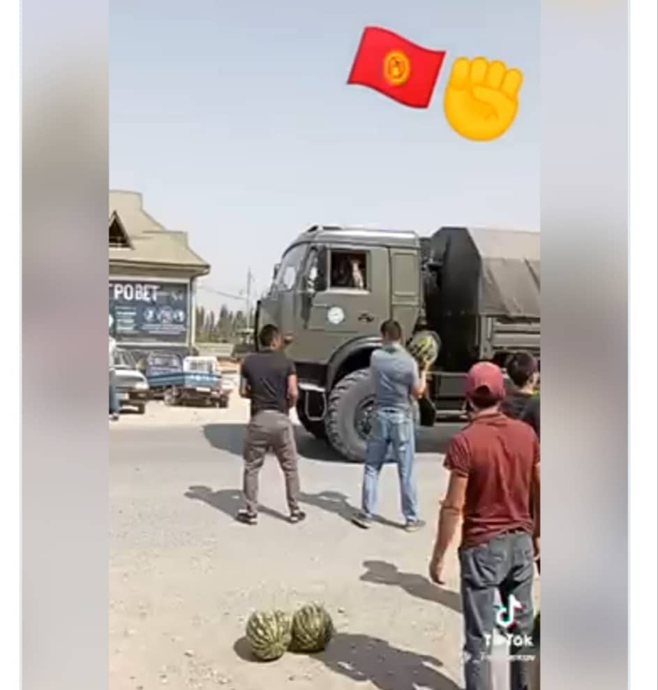 Кыргызстандыктар өтүп бара жаткан аскерлер толо жүк ташуучу унааларга дарбыз ыргытышууда. Видео TikTok сайтында пайда болду.