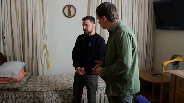 Украинанын президенти Владимир Зеленский журналистке президенттин иш бөлмөсүндөгү өзү жашап жаткан бөлмөнү көрсөттү. Анын айтымында, ал согуш башталгандан бери ошол жерде жашап жатат. Украиналык телеалпаруучу Дмитрий Комаровдун "Год" документалдык долбоорунда бул кадрлар көргөзүлдү.